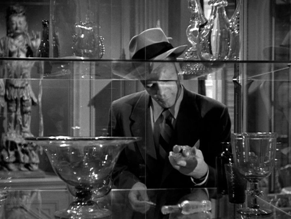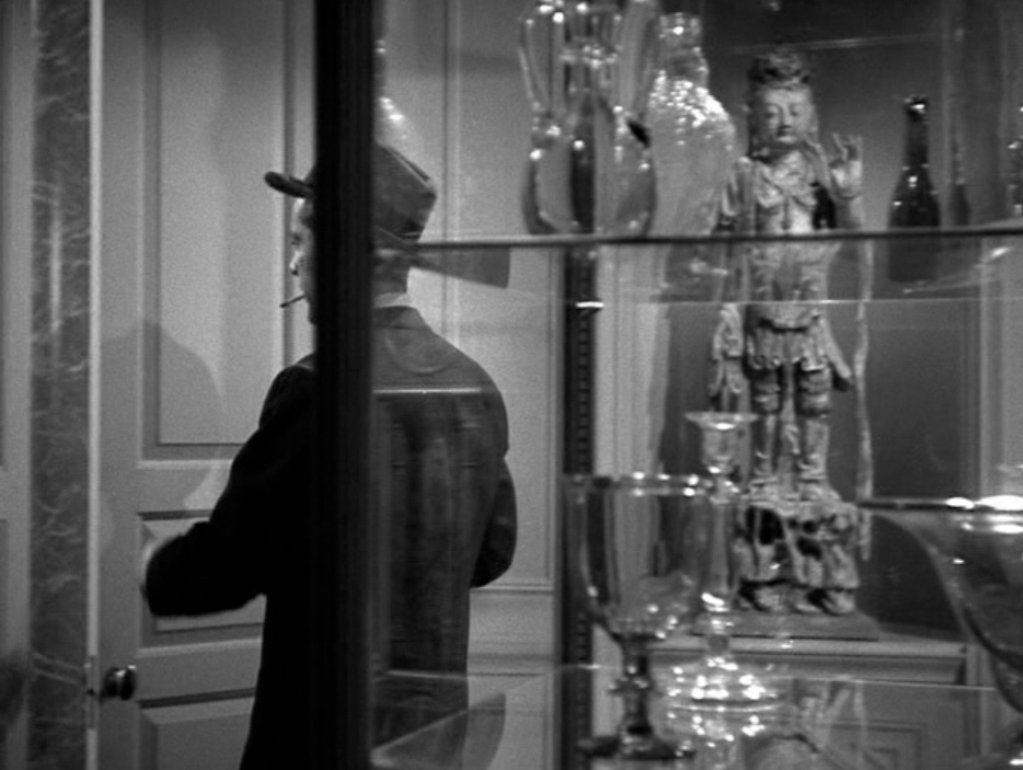 A short tracking shot “reframes” the  back of the display cabinet. McPherson studies Waldo’s precious glass collection from behind the sliding door…