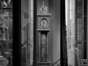 Traveling continues slowly, revealing a rare model of a “grandfather clock” (visual CLUE given here: a comment will quickly indicate that Laura has the SAME clock at her place.) Waldo comments on his loneliness in the deserted New York, and the poignant feeling of loss since “Laura’s horrible death”).
