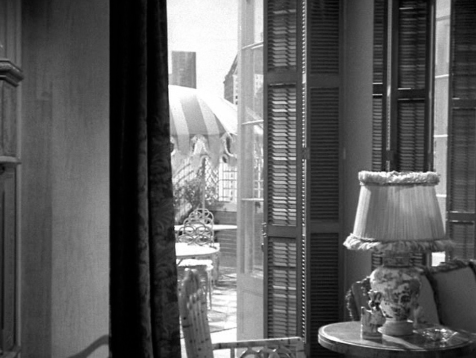 Through shutters of a half-open French window: a sunny terrace…