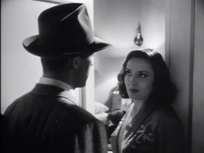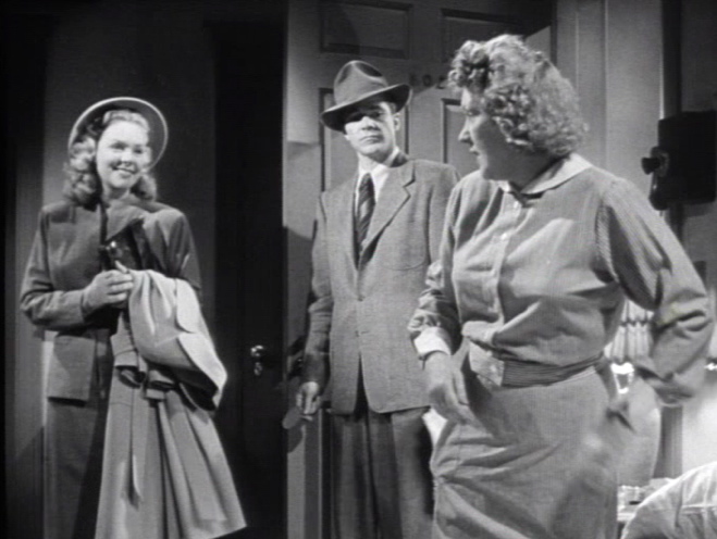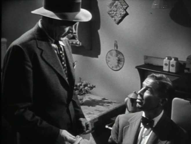 He goes back to his wife, gets drunk to have sex with her (seemingly for the first time), and deserts her for the rest of the night. Marty Holland’s novel then proceeds with the announcement of Stella’s death. (The body’s state and the lethal wounds inflicted to her are briefly described; her burial is mentioned along with the town’s reactions.) Although deeply affected by the drama, Eric is tempted to leave Walton and his wife. In the meantime, June has received the visit of a strange-looking, fat policeman: Judd (Charles Bickford) who astutely extracted from her several pieces of damning information about Eric – his pretending to be a “medium”, his defection during the night of the murder. Eric quickly finds himself under pressure, since Judd has included him in his list of prime suspects. First one is Atkins (Bruce Cabot), a traveling salesman who’s been harassing Stella for years. Besides Eric, poor, harmless old Pop (Percy Kilbride) seems to be under suspicion. (In chapter 13, a “clue” discretely planted: Judd tells Eric Pop gave some high-priced jewels to Stella as a token of his love. This imprudent lie will ultimately be exploited to unmask the real culprit… and we have to ask ourselves why the scenario omitted that crucial detail, at the risk of rendering the ending obscure and hasty.)
